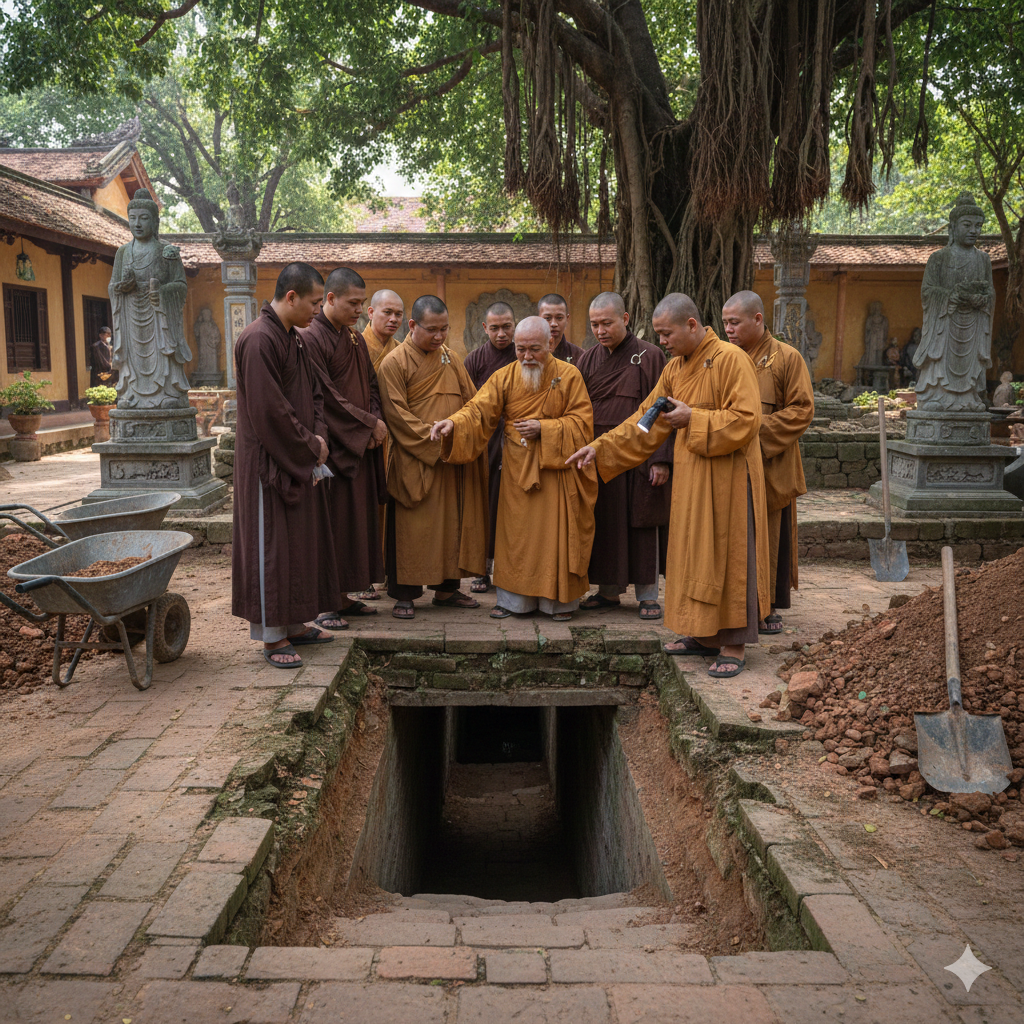 Mấy chú tiểu hí hửng lấy cuốc xẻng, bắt đầu gỡ từng viên gạch lên. Nhưng chỉ lát sau, chú tiểu Minh – cậu bé mười ba tuổi lanh lẹ nhất – chợt gọi to:
